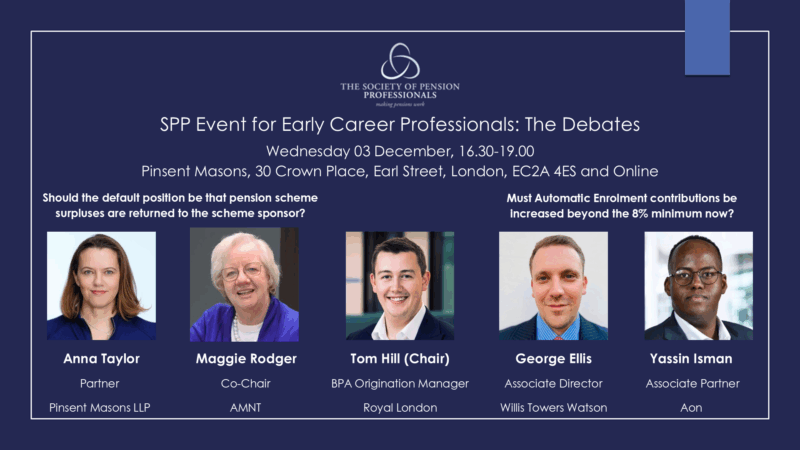 You’re invited to join our annual Early Career Professionals Debates event on Wednesday, 3rd December, from 16:00 to 19:00. This event will bring together industry experts to generate discussion on two key issues in pensions in an informal debate setting. Both debates will conclude with a live audience vote to decide the winner! Following the session there will be networking drinks to enable you to connect with others and continue the discussions.